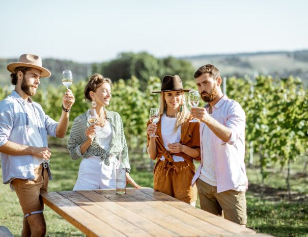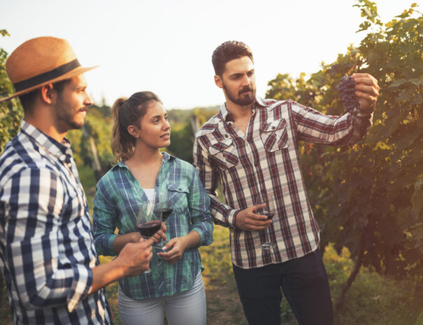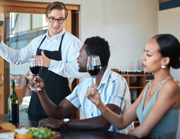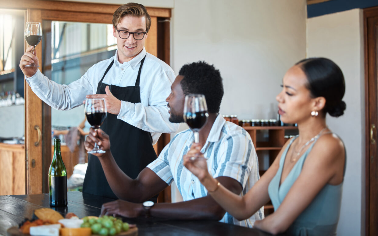 Wine tasting with black couple and professional sommelier explaining the blend and flavor of red wine. Couple enjoying a drink, learning about wine making process at a restaurant with happy winemaker.